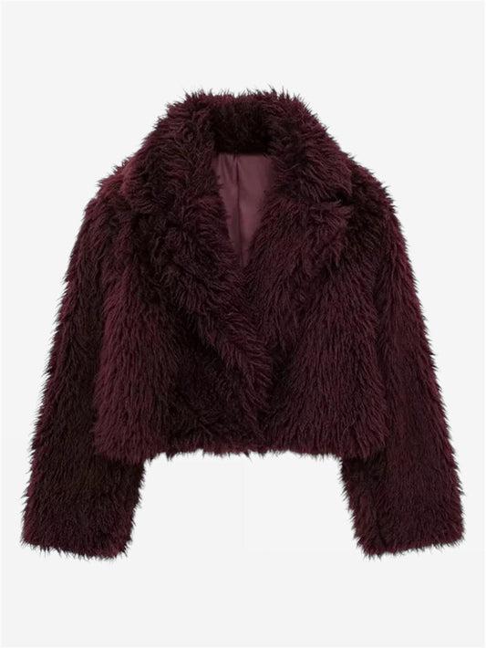 Kurzer Pelzmantel in Bordeauxrot mit breitem Kragen