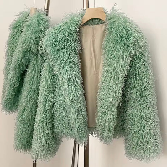 Salbeigrüne Kunstpelzjacke im mongolischen Stil