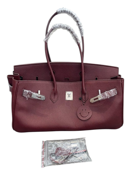 100% Echtleder Handtasche Klassiker 42cm, Silber Verschluss + Schloss, Bordeaux
