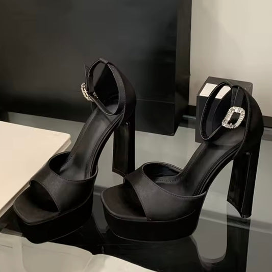 Satinierte Plateau High-Heels mit einer Strass Schnalle