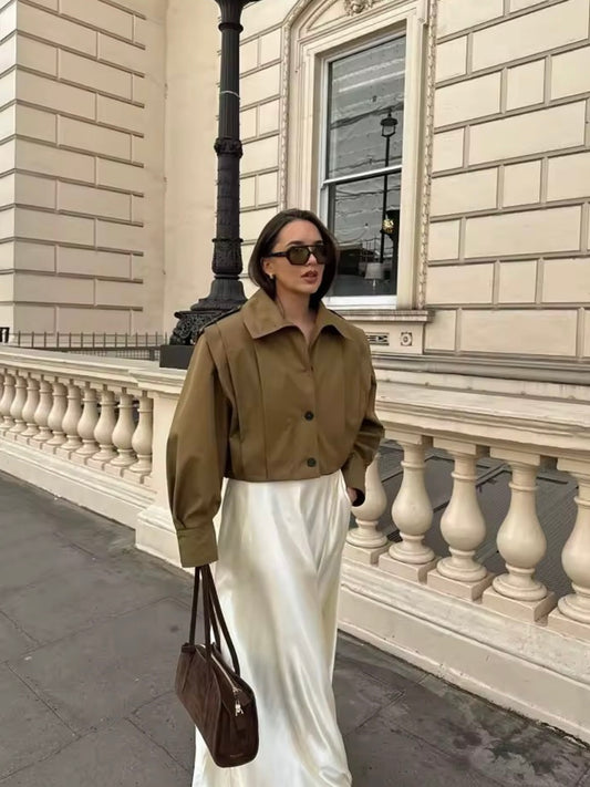 Glanz Kunstleder Hemd-Jacke mit Taschen und ausgestelltem Kragen