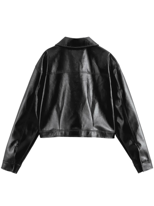 Glanz Kunstleder Hemd-Jacke mit Taschen und ausgestelltem Kragen