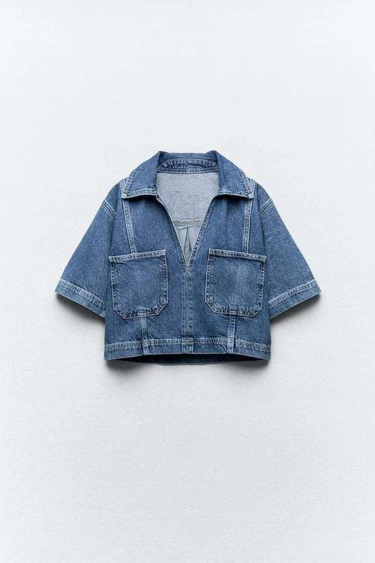 Zweiteiliges Denim Outfit mit Kurzarmjacke und Hosenrock